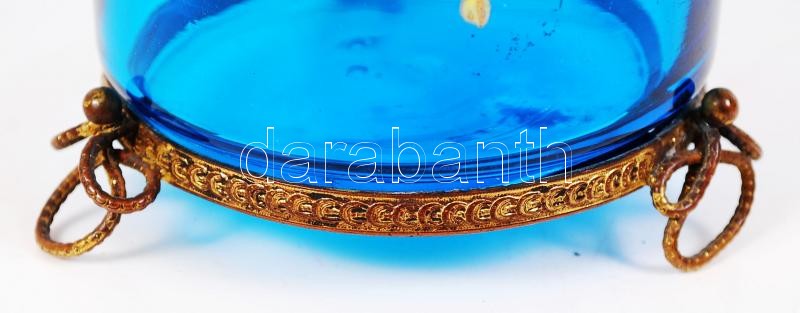 Festett üveg bonbonier, réz rárakásokkal, sérült, m:10 cm, m:9 cm