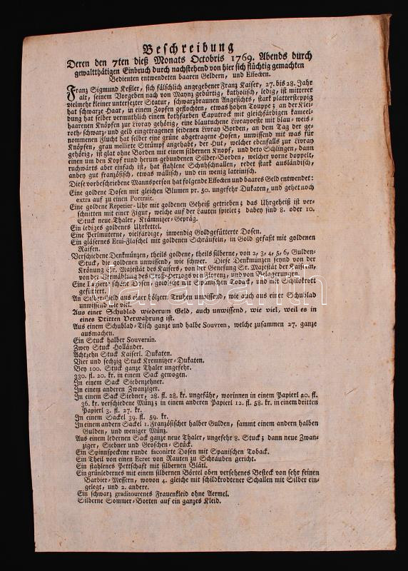 1769 Részletes leírás német nyelven egy betörés alkalmával ellopott tárgyakról és értékükről.
