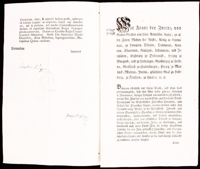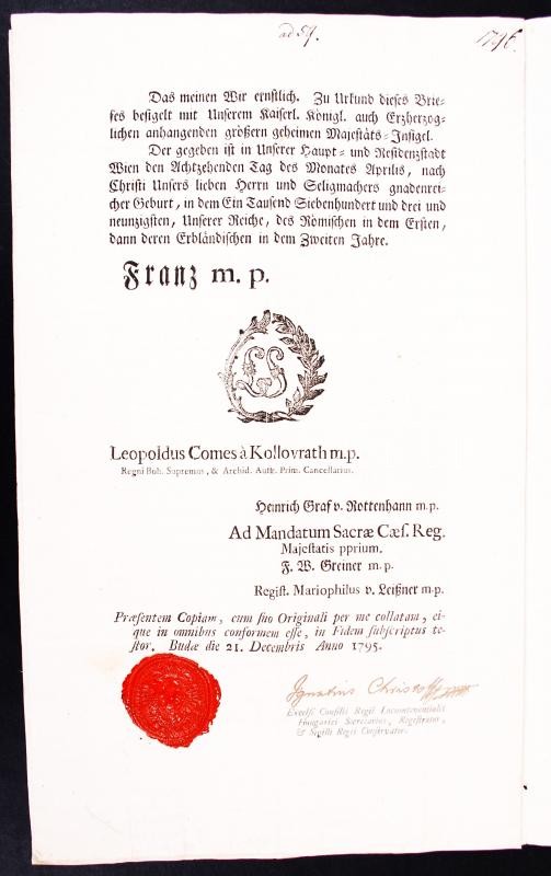 Description: 1796 Helytartótanácsi levél szerzői jog témakörben. Német nyelvű melléklete királyi pecséttel ellátva. József főherceg későbbi nádor és Kristóf Ignác saját kezű aláírásával, királyi pecséttel / Letter of the Governing Council with autograph signiture of Francis II Holy Roman Emperor. With supplement in german, sealed with royal seal.