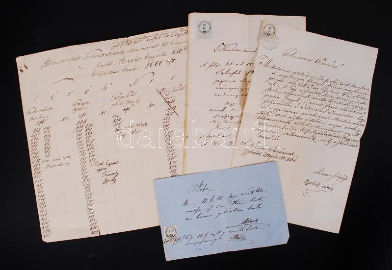 1850-1868 Vegyes iratok (árverési jegyzék, levél városi tanácsnak, törvényszéknek)illetékbélyegekkel.