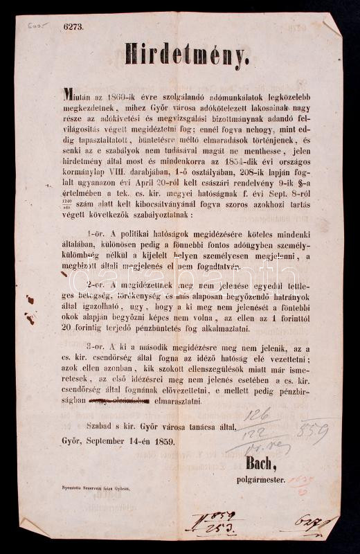 1859 Adózással kapcsolatos hirdetmény Bach győri polgármestertől.