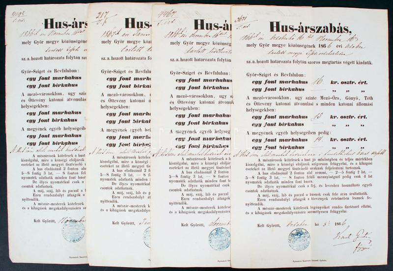 1866-1867 Győr, Győr megyei húsárszabásról szóló dokumentumok pecséttel, főjegyzői aláírással(4 db).