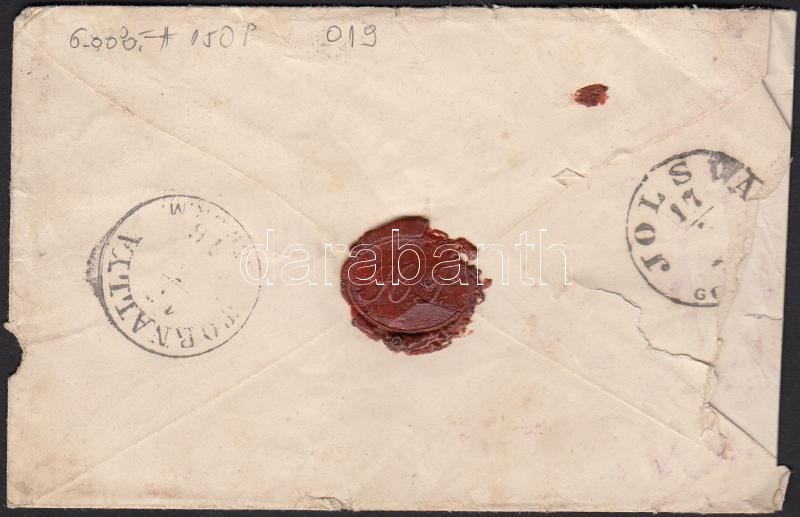 1876 Budapest, Budapestről Jolsvára küldött levélboríték Tornallyán keresztül hátulján viaszpecséttel.