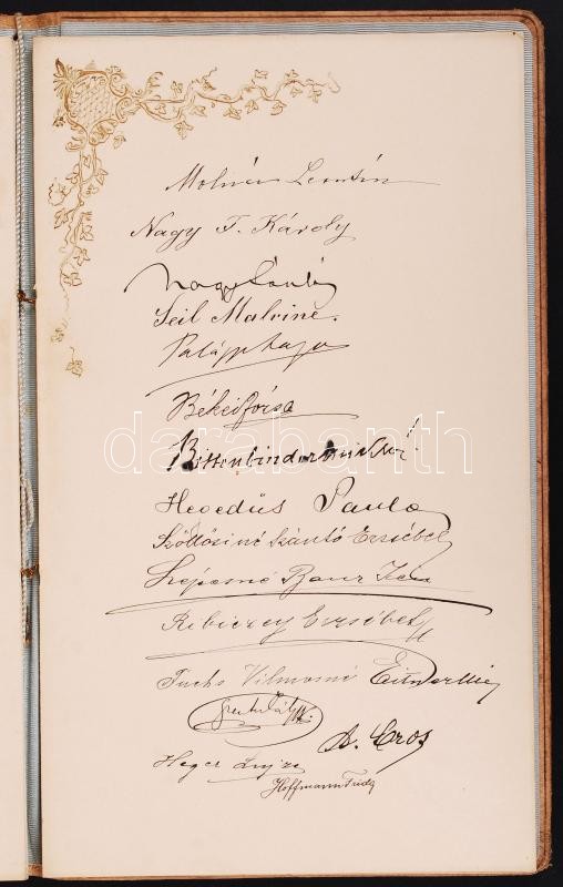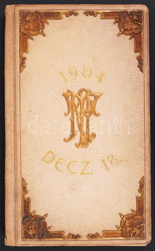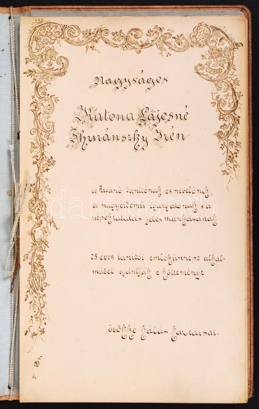 1904 Katona Lajosné Thuránszky Irén népoktató, elkötelezett nÅ‘nevelÅ‘ 25 éves tanÃtói emlékünnepére Palágyi Lajos által Ãrt és a kartársak által ajánlott Ünnepi dal c. vers 24 aláÃrással (köztük Nagy László pedagógus a Gyermektanulmányi Társaság alapÃtója, Palágyi Lajos tanár, költÅ‘, szÃnműÃró, Hajpál BenÅ‘ budai ref. lelkész, Ãró, Dr. Kiss Arnold rabbi, Ãró, az Országos RabbiképzÅ‘ Intázet tanára) bÅ‘rkötésben, rézverettel, a fedÅ‘lapon dÃszes KTI monogrammal