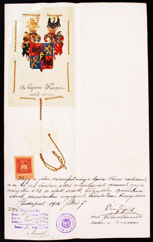 1906 A lipóczi Keczer család címerének hivatalos igazolása, kézzel fes...