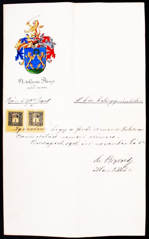 1906 A tolcsvai Bónis család címerének hivatalos igazolása, kézzel fes...