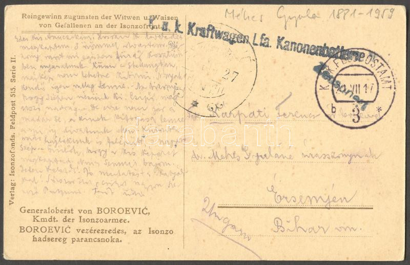 1917 Méhes Gyula farmakológus, biológus, egyetemi tanár saját kézzel írt képeslapja frontról feleségének