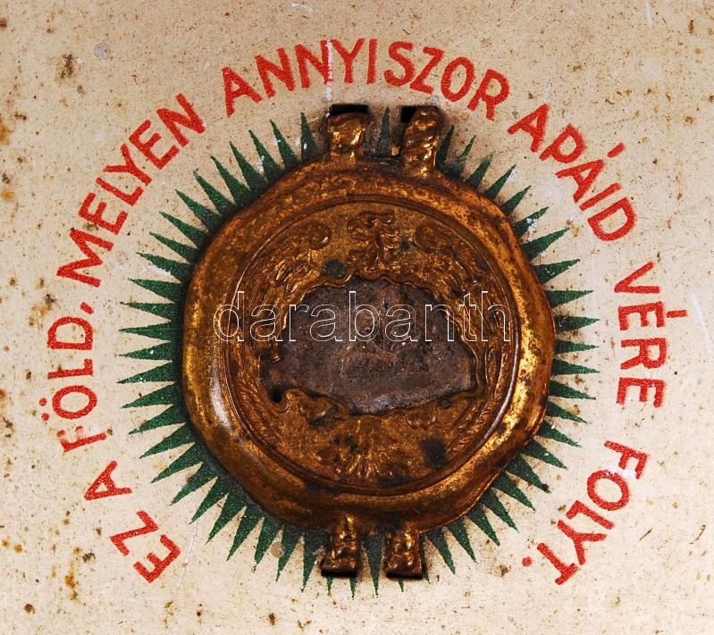 1929 Országos Magyar Hadimúzeum Egyesület Nemzeti Ereklye sorszámozott, névre szóló. Nagy-Magyarország valamennyi vármegyéjének földjéből származó földet tartalmazó emlék 7x10 cm