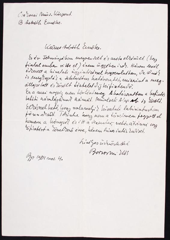 1984 Borsos Miklós saját kézzel írt levele aláírásával