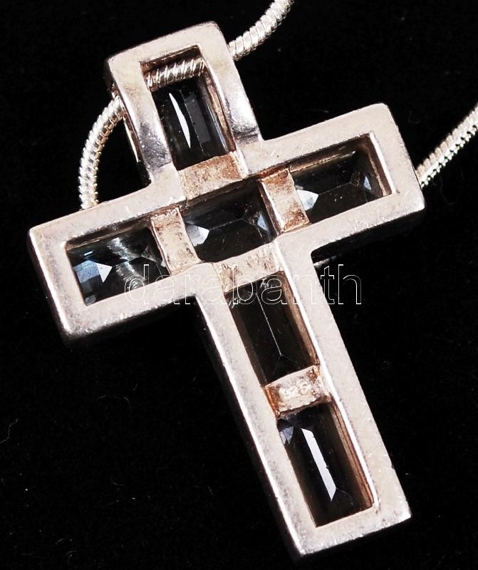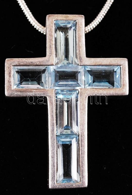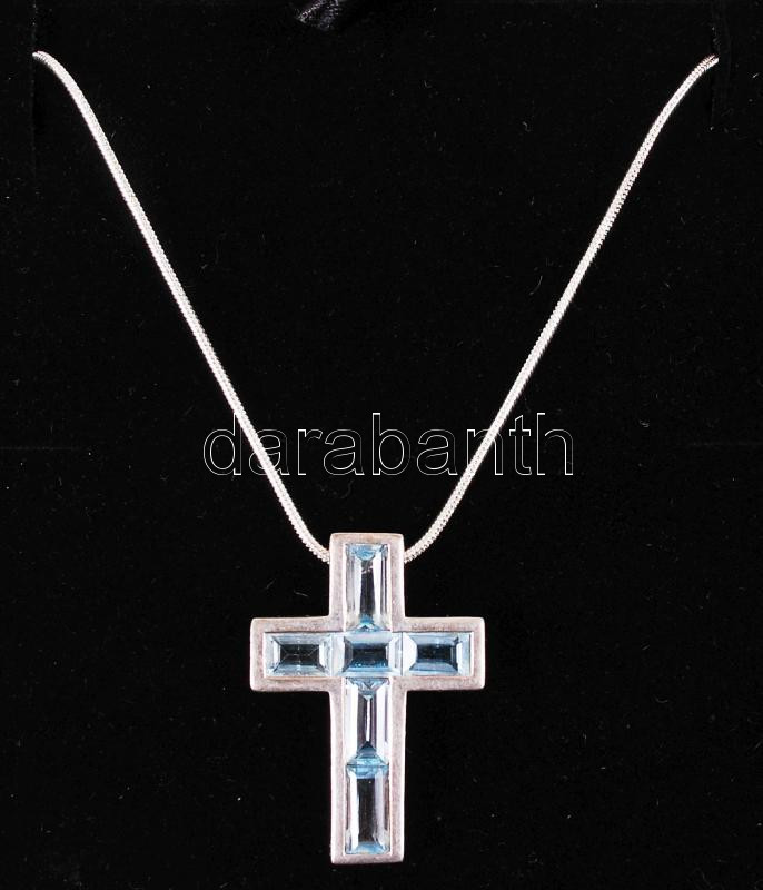 Ezüst (Ag.) függő, ezüst nyakláncon, kereszt forma topáz berakással, bruttó:17 g