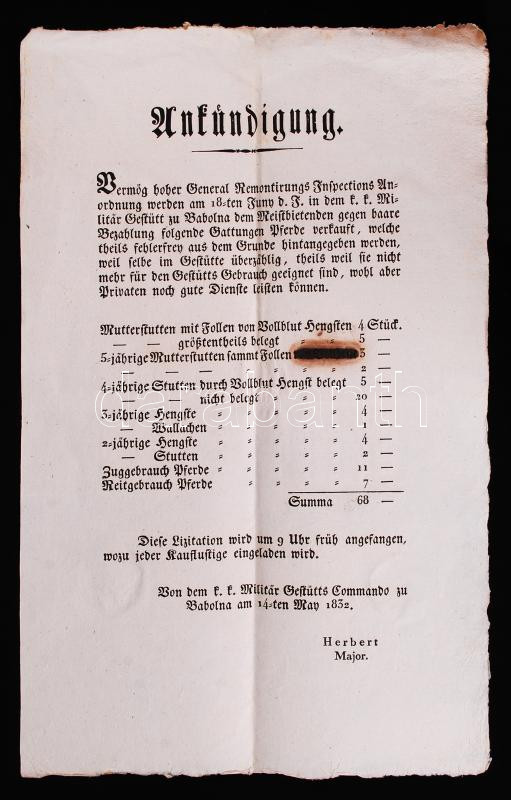 https://www.darabanth.com/en/197-Online-auction/197.0/Other-collectibles/Military~600025/1832-Babolna-altal-kiadott-nemet-nyelvu-hirdetmeny-katonai-lovak-eladasarol~II760660