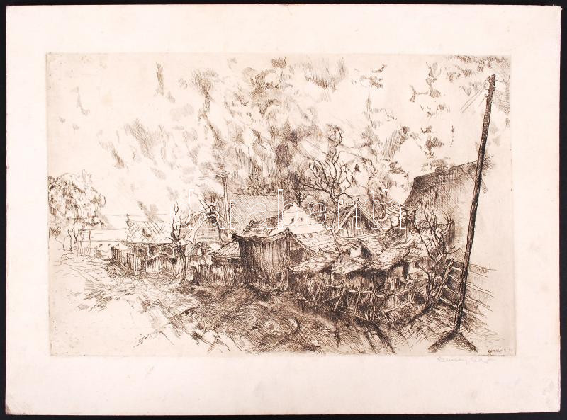 Remsey Gábor (1925-1999): Falu vége. Rézkarc, papír, jelzett, 19×29 cm