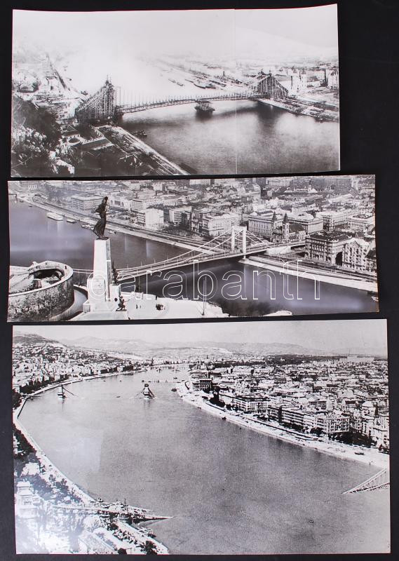 Description: 1901-1965 Az Erzsébet hidak története három panoráma képen; 1901 építés közben (repró) 18x35 cm; 1944 felrobbantva, 24x39; 1965 az átadott új Erzsébet híd, amerikai retussal feljavítva, 15x39 cm