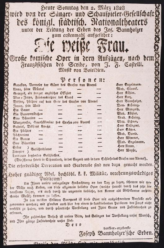 1828 Német nyelvű színházplakát a "Die weiße Frau" című színdarab előa...