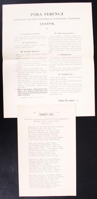 1894 Póra Ferenc leányiskolai igazgató nyomtatott önéletrajza, neki szóló dicsőítő vers