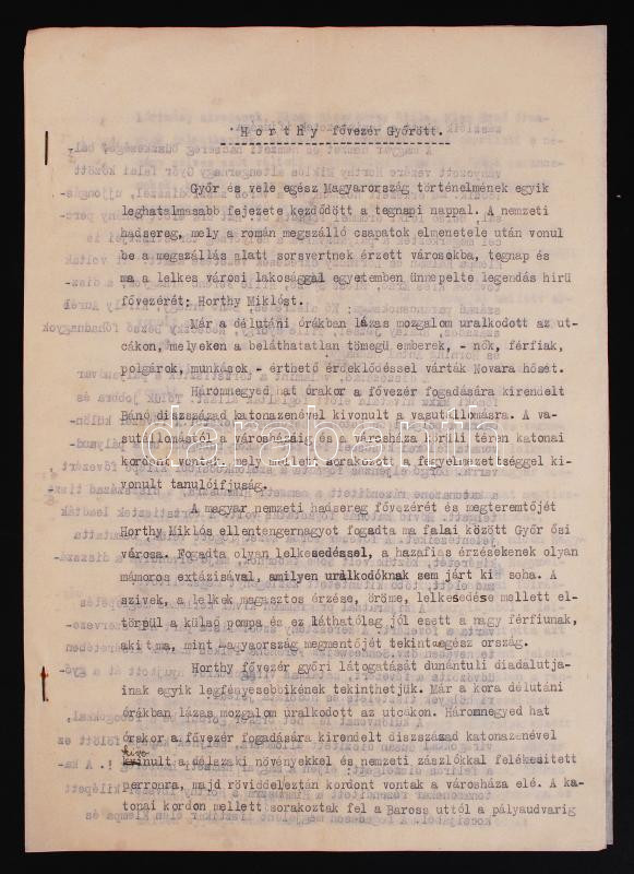 1921 Horthy Miklós győri látogatásáról szóló cikk 8 oldalas gépelt kéz...