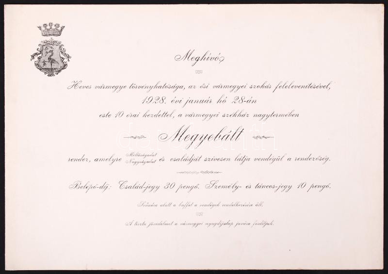 1928 Meghívó Heves vármegye törvényhatósága által rendezett megyebálra...