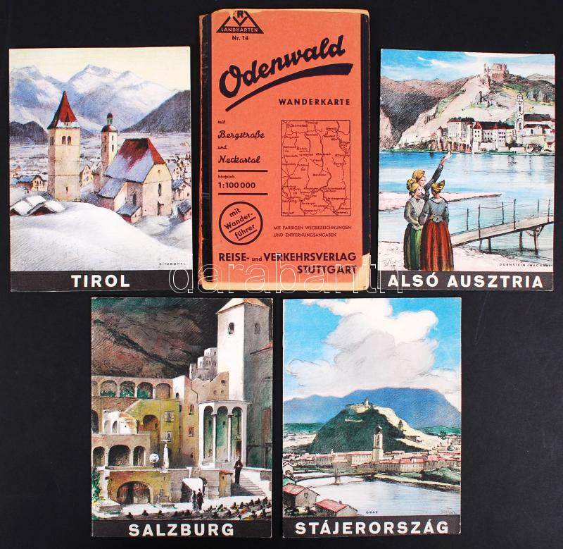 cca 1930 4 db Bécsben kiadott, magyar nyelvű utazási prospektus (Tirol, Alsó-Ausztria, Stájerország, Salzburg) + régi térkép