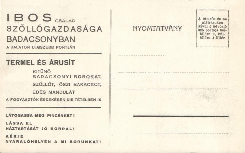 Badacsony, Ibos család szőlőgazdasága, borszállítás, kúria, pince, reklám a hátoldalon