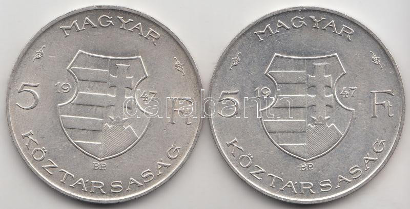 https://www.darabanth.com/en/198-Online-auction/198.0/Numismatics/Hungarian-metal-and-silver-coins~8/1947-5Ft-Ag-Kossuth-2x-T2-2-~II767677