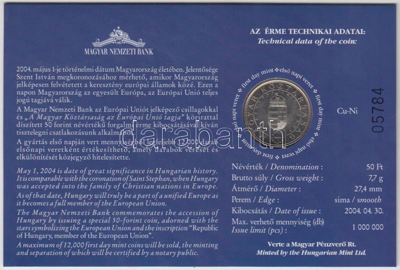 https://www.darabanth.com/en/198-Online-auction/198.0/Numismatics/Hungarian-metal-and-silver-coins~8/2004-50Ft-Magyarorszag-az-EU-tagja-elsonapi-veret-sorszamozott-emleklapon-TBU~II768185