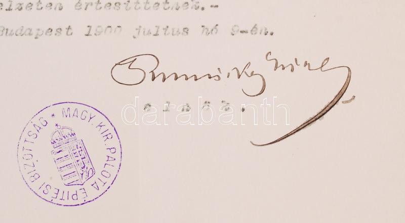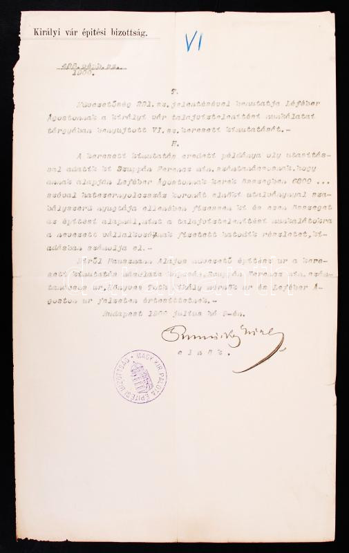 1900 báró Podmaniczky Frigyes a Királyi Vár Építési Bizottság elnöke által aláírt hivatalos levél, a vár víztelenítési munkáival kapcsolatban