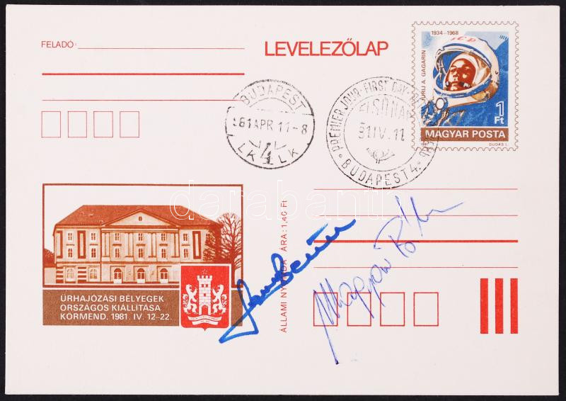 1981 Farkas Bertalan (1949-) és Magyari Béla (1949-) magyar űrhajósok aláírása levelezőlapon, 10x15 cm.