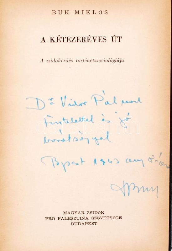 Description: Buk Miklós: A kétezeréves út. A zsidókérdés történetszociológiája. Budapest, Magyar Zsidók Pro Palesztina Szövetsége. Dr. Vidor Pál főrabbi részére dedikálva, kartonál.,