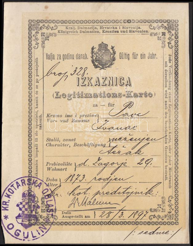 1897 Ogulin, Horvát Királyság által kiállított igazolvány szlovén és n...