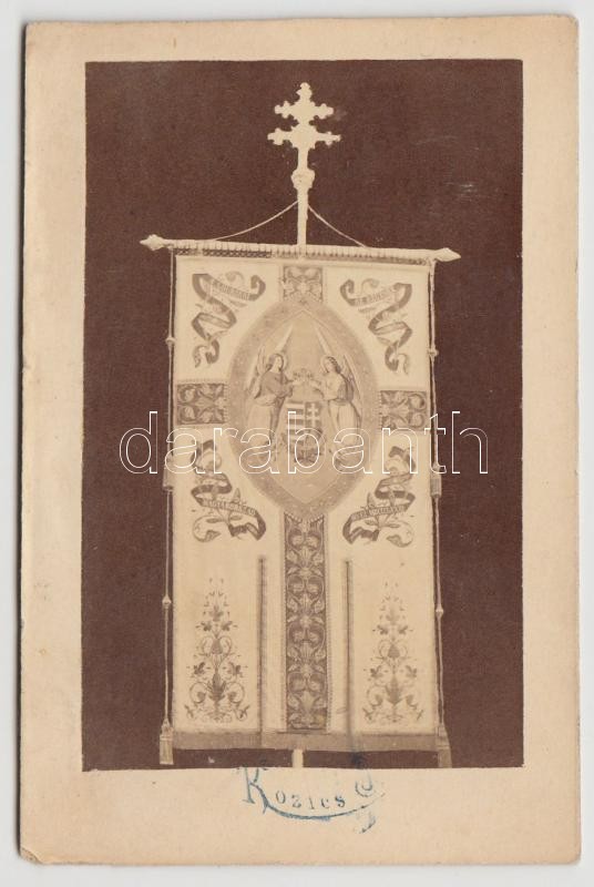 cca 1900-1910 A lourdesi szűznek ajánlott zászlóról készült képoldalas fénykép, a zászló mindkét oldala látható, kartonra ragasztva, 11x7 cm.