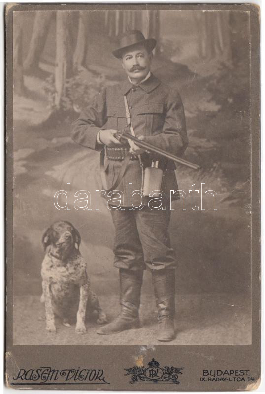 cca 1910-1920 Rasem Victor: Vadász és kutyája, műtermi fotó, a kabinet...