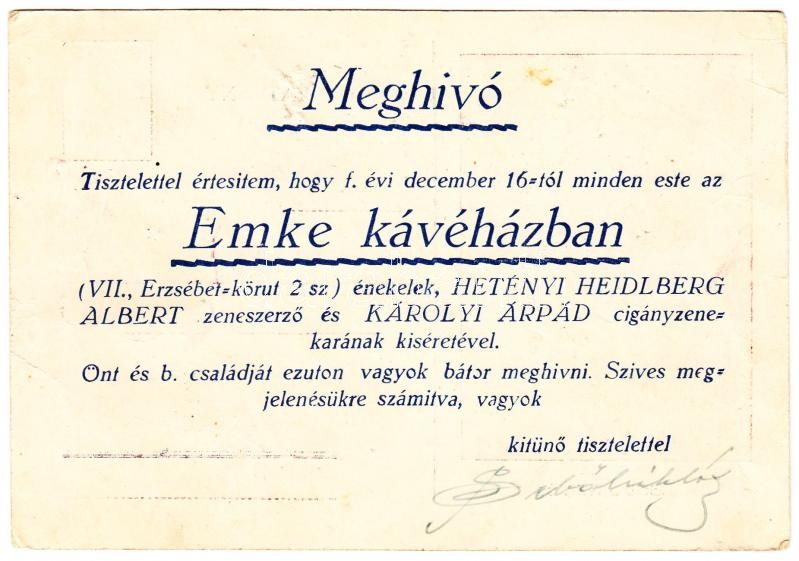 cca 1930 Sebő Miklós nóta- és dalénekes aláírt meghívója az Emke kávéh...