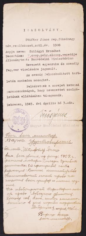 1945 Felszabadított területeken való szabad mozgásra jogosító magyar-orosz kétnyelvű igazolvány / Hungarian-Russian ID