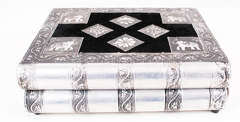 Elefánt motívumos ékszertartó, fém, plüss, belsejében kinyitható rekeszekkel, tükörrel, kulcs nélkül, jó állapotban, 28×21 cm