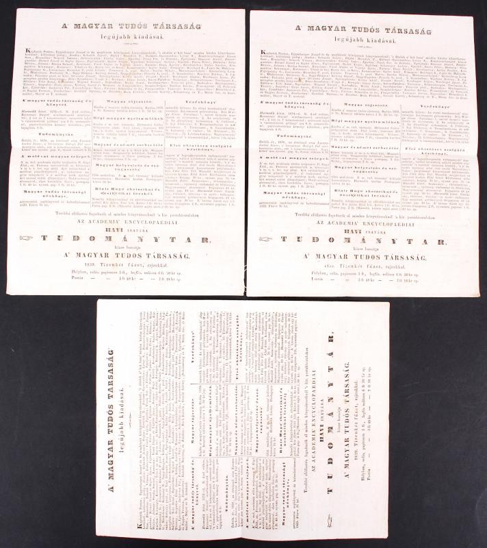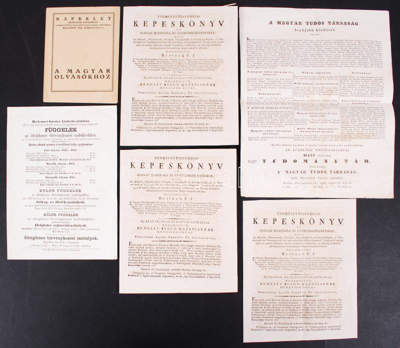1838-1922 Ismertető nyomtatványok a Magyar Tudós Társaság kiadványairól, természettudományi képeskönyvről, Napkeletről.