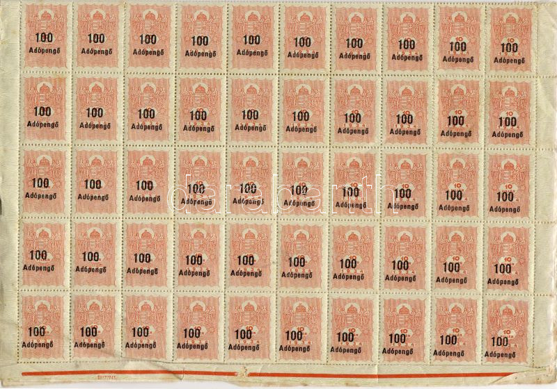 1946. 100 Adópengő okmánybélyeg teljes 200-as ív, gyűrött / Stempelmar...