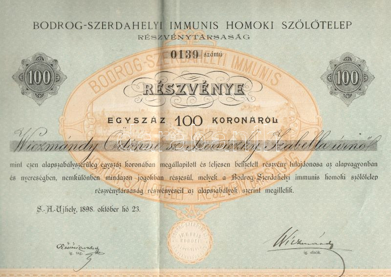 https://www.darabanth.com/en/2-Major-auction/2.1/Art-and-collectibles/~531/1898-Bodrog-Szerdahelyi-Immunis-Homoki-Szolotelep-100K-reszveny-Weinbau-Gesellschaft-Aktie~II41423
