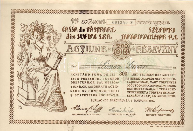 1927. Széplaki Takarékpénztár Rt. 300 Lei részvény/ Széplak (Suplac) Sparkasse Aktie