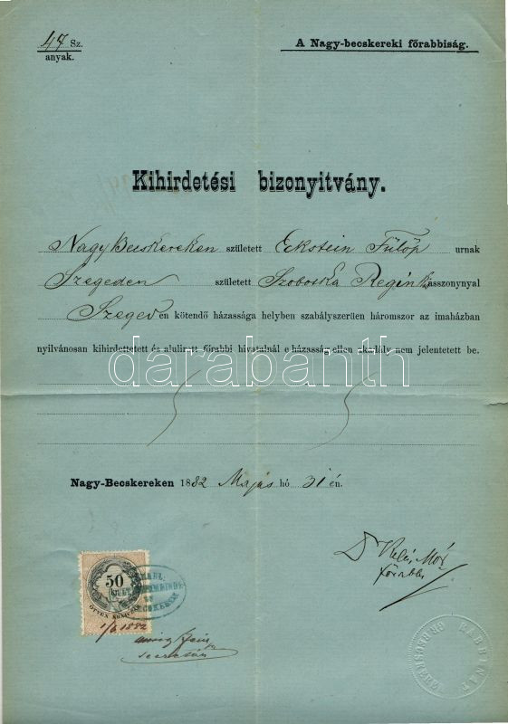 https://www.darabanth.com/en/2-Major-auction/2.1/Art-and-collectibles/~538/1882-Okmany-a-nagybecskereki-forabbi-alairasaval-es-pecsetjevel-Dokument-mit-Stempel-und-~II41408
