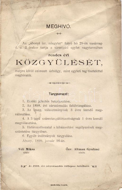 1899 Meghívó az abonyi izraelita nőegylet közgyűlésére/ Einladung für ...