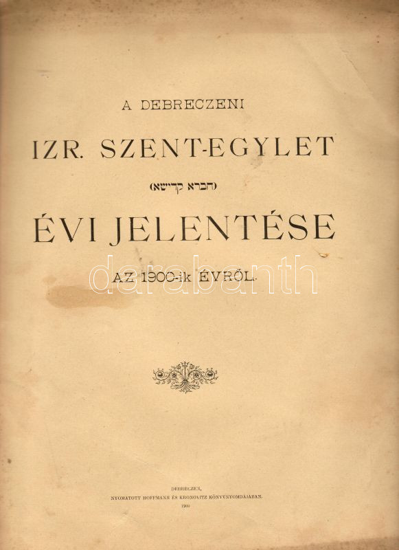 1900 A Debreczeni Chewra Kadisa zárszámadása; Hoffman és Kronovitz nyo... https://www.darabanth.com/en/2-Major-auction/2.1/Art-and-collectibles/~538/1900-A-Debreczeni-Chewra-Kadisa-zarszamadasa-Hoffman-es-Kronovitz-nyomdaja-Schlussrechnung-d~II38599