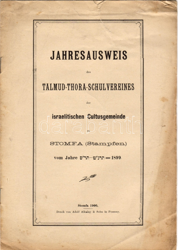 1900 A stomfai izraelita hitközség talmud-thora iskolaegyletének évkön... https://www.darabanth.com/en/2-Major-auction/2.1/Art-and-collectibles/~538/1900-A-stomfai-izraelita-hitkozseg-talmud-thora-iskolaegyletenek-evkonyve-Adolf-Alkalay-es-fi~II35537