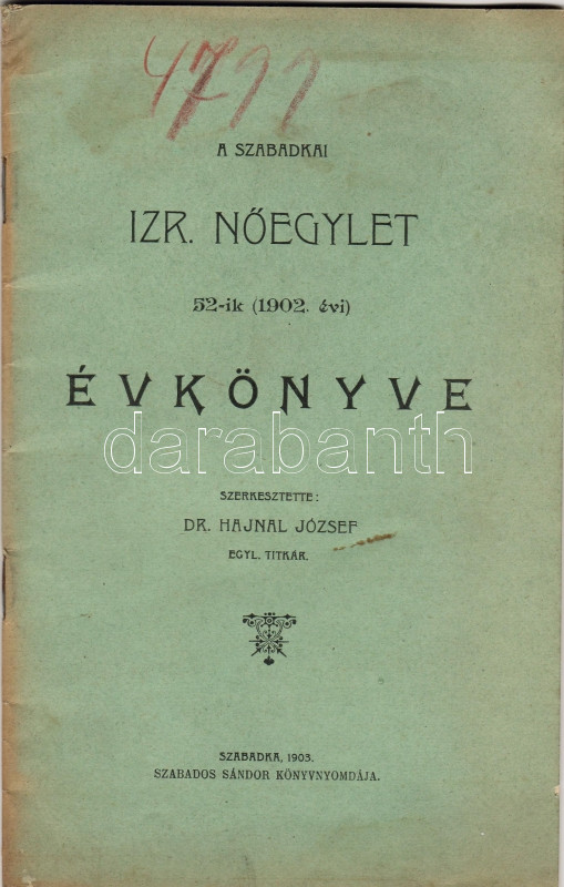 https://www.darabanth.com/en/2-Major-auction/2.1/Art-and-collectibles/~538/1903-A-szabadkai-izraelita-noegylet-1902-evi-evkonyve-Szabados-Sandor-konyvnyomdaja-Szabad~II35534