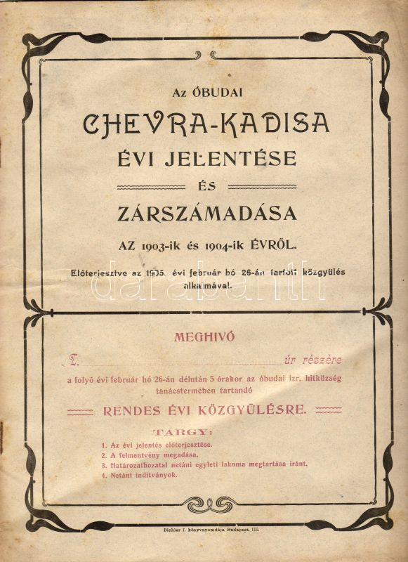 1905 Az óbudai Chevra Kadisa évi jelentése és zárszámadása; Bichler I.... https://www.darabanth.com/en/2-Major-auction/2.1/Art-and-collectibles/~538/1905-Az-obudai-Chevra-Kadisa-evi-jelentese-es-zarszamadasa-Bichler-I-nyomdaja-Jahresberi~II40868