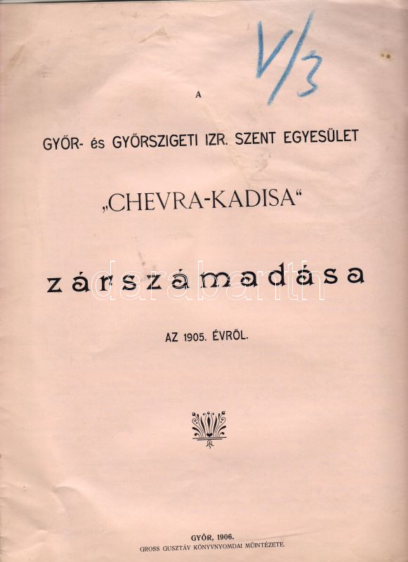1906 A Győr és Győrszigeti Chewra Kadisa zárszámadása; Gross Gusztáv n... https://www.darabanth.com/en/2-Major-auction/2.1/Art-and-collectibles/~538/1906-A-Gyor-es-Gyorszigeti-Chewra-Kadisa-zarszamadasa-Gross-Gusztav-nyomdaja-Schlussrechn~II38597