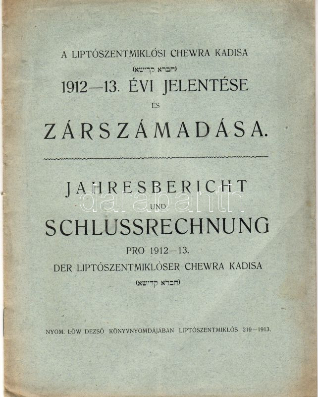 1913 A Liptószentmiklósi Chewra Kadisa zárszámadása magyar és német ny... https://www.darabanth.com/en/2-Major-auction/2.1/Art-and-collectibles/~538/1913-A-Liptoszentmiklosi-Chewra-Kadisa-zarszamadasa-magyar-es-nemet-nyelven-Low-Dezso-nyom~II38593