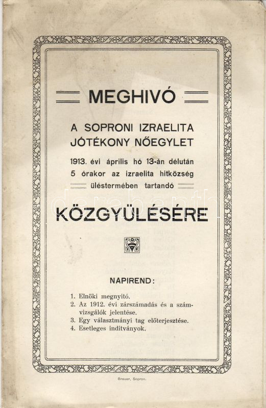 https://www.darabanth.com/en/2-Major-auction/2.1/Art-and-collectibles/~538/1913-Meghivo-a-Soproni-izraelita-jotekony-noegylet-kozgyulesere-Breuer-Sopron-Israelit~II36081