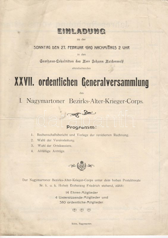 Description: 1910 Meghívó Nagymartoni Régi Kerületi Harcosok gyűlésére német nyelven; Kohn nyomdája / Einladung zu der XXVII. ordentlichen Generalversammlung des I. Nagymartoner Bezirks-Alter-Krieger-Corps
