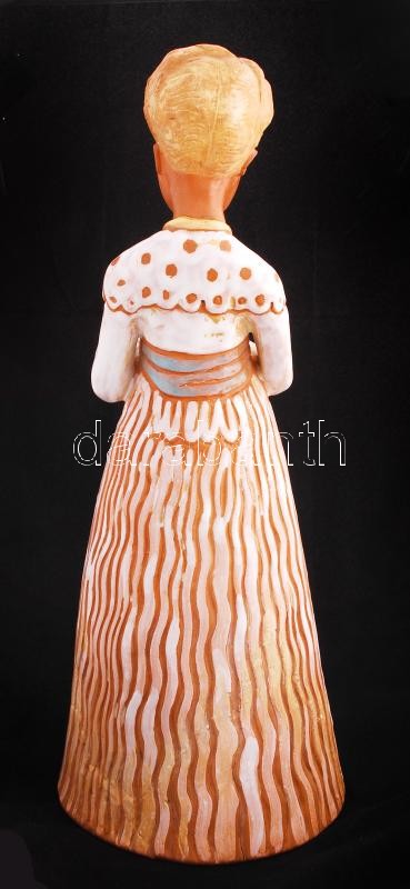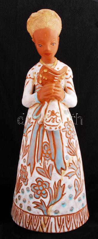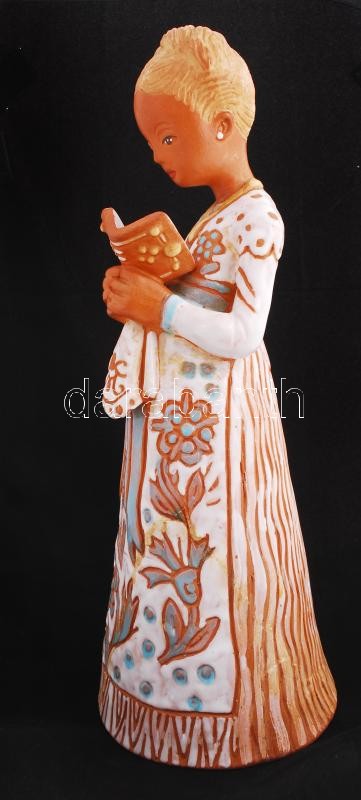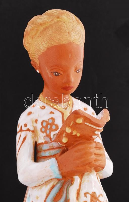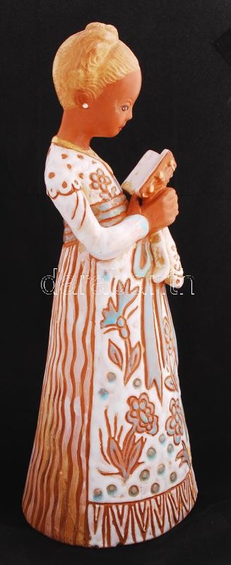 Kovács Margit (1902-1977): Olvasó. Festett kerámia, jelzett, sérült, ragasztott, m:33 cm / Girl with book. Painted ceramic with cracked