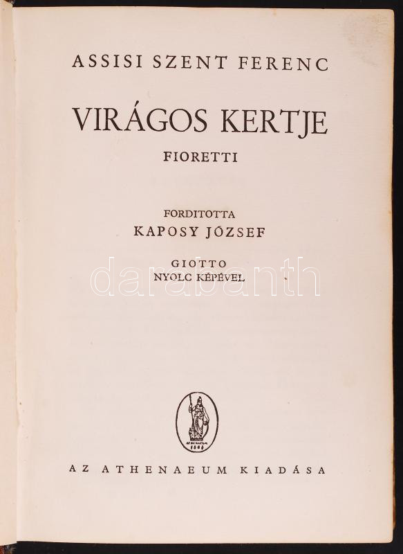 Fioretti: Assisi Szent Ferenc virágos kertje. Fordította Kaposy József. Giotto nyolc képével. Bp., Athenaeum. Illusztrált, félvászon kötés, kopottas állapotban.